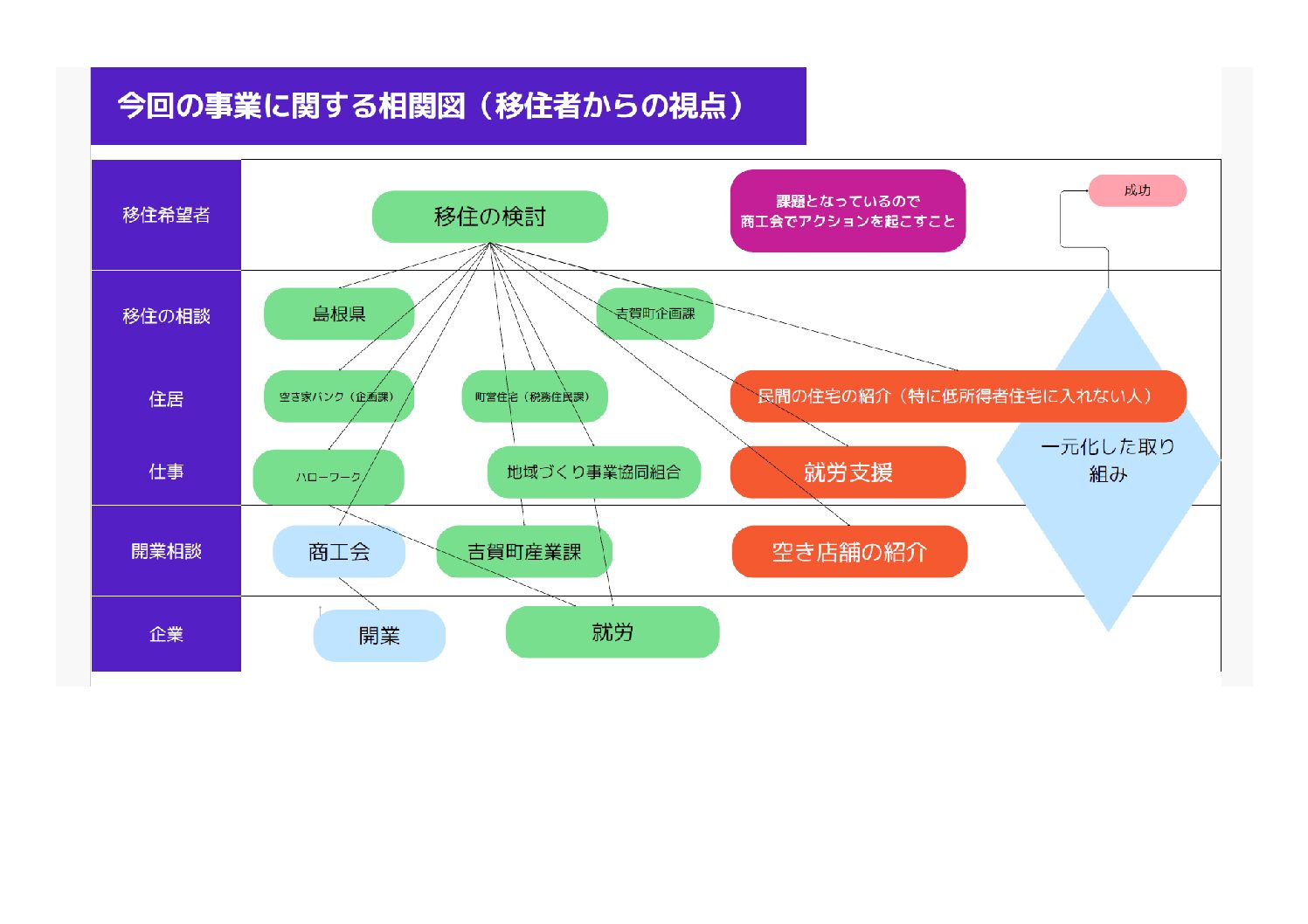 - 吉賀町に移住をしてくれた方に、さまざまな業種のお仕事のご紹介(事業所別の会社紹介や求人情報を掲載)や、住居に関する紹介、空き店舗の紹介、そこから事業をはじめたい方は商工会で「創業」からはじめて事業の総合的なお手伝いをさせていただくというサービスです。
