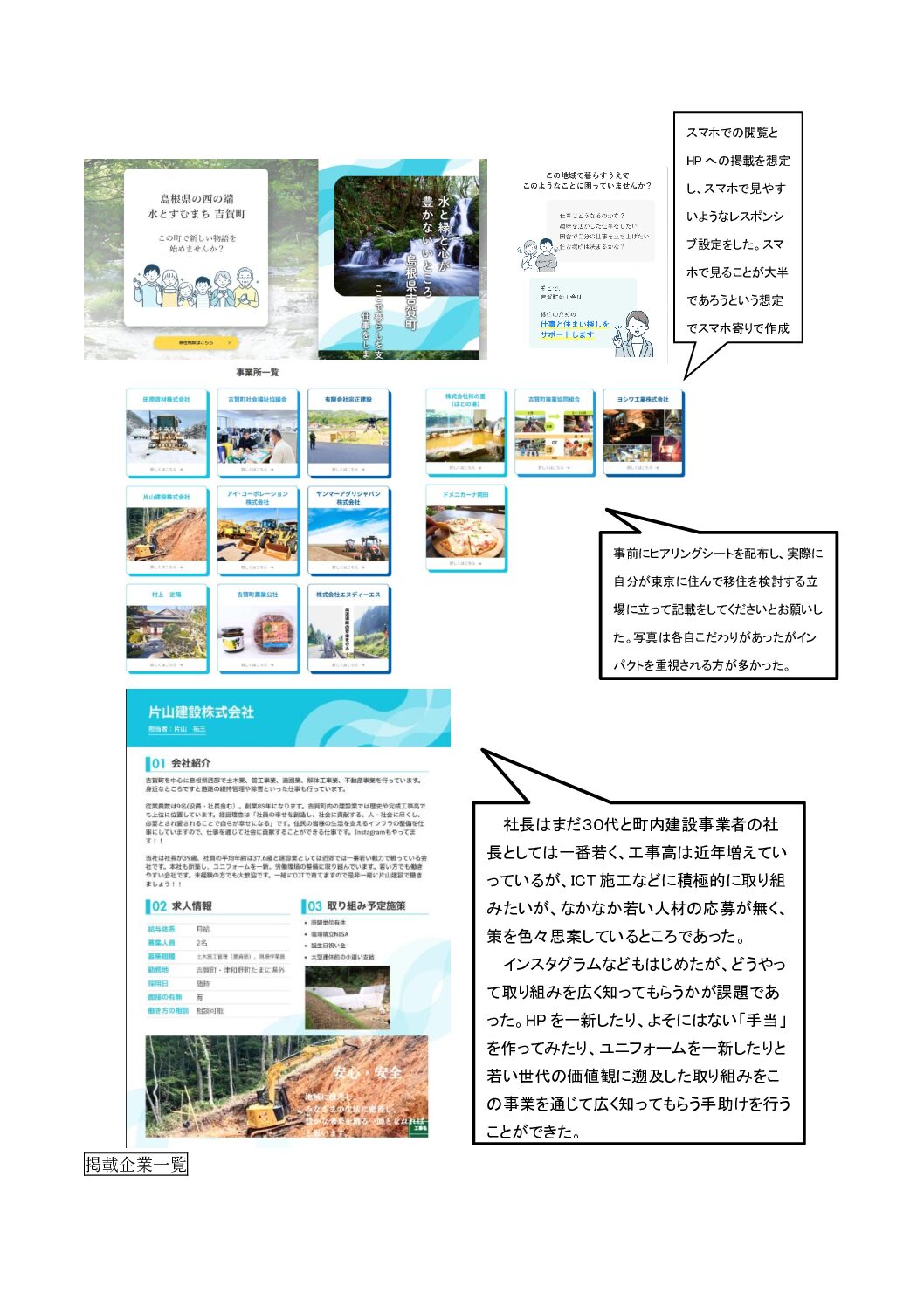 町内13社の人材不足解消に向けた取組みに参画することができ、全社から良いご意見をいただき、今まであまり関与できなかった製造業などの企業にもお役に立つことができ、成果物(紹介ページ)を残すことができた。